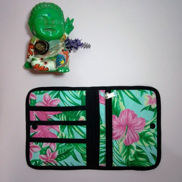 Billetera organizador, lo podes usar como quieras. Tiene tarjeteros, bolsillo con cierre. Su cierre es con snap. Está realizado en gabardina estampada. Medidas de la billetera abierta 18 cm de alto y 24 cm de ancho.