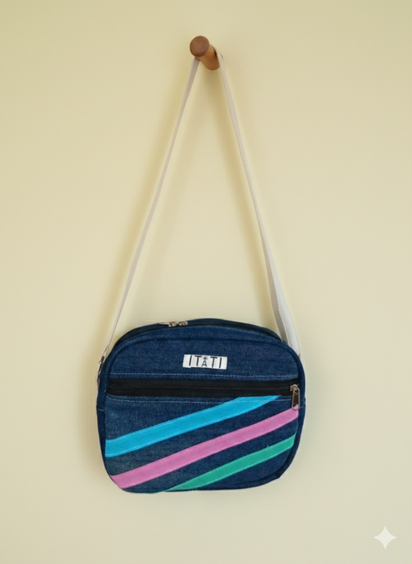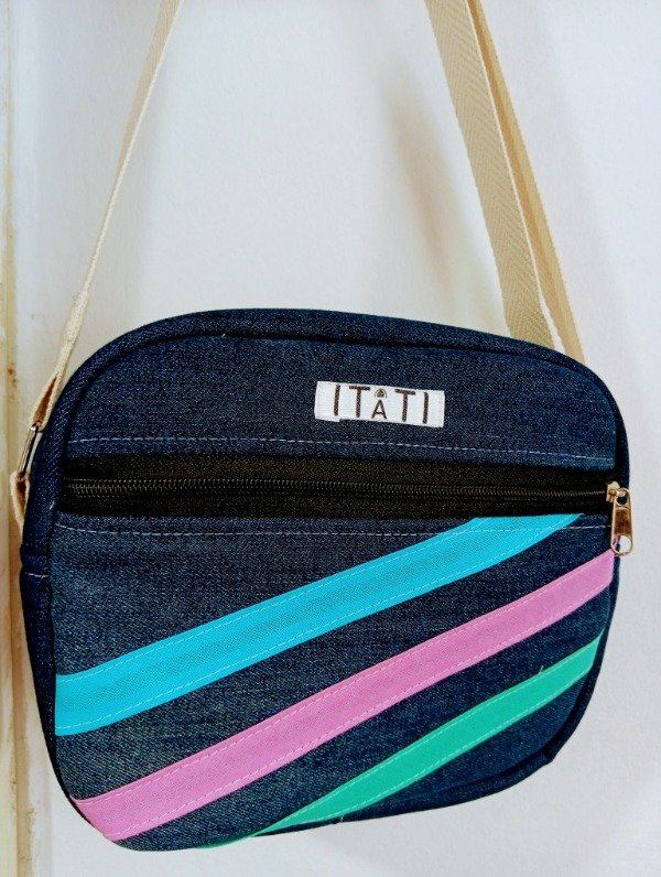 Bandolera realizado en tela de jeans reciclado. Tiene bolsillo exterior con cierre e interior. Viene con correa regulable. Ideal para una salida distendida. Sus medidas son: Alto 20cm y Ancho 25cm.